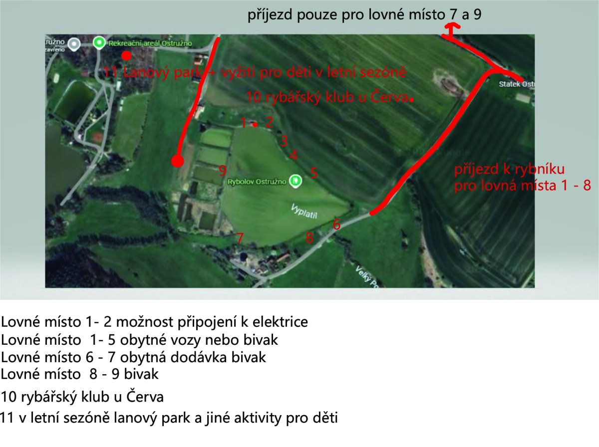 Je zde vybudováno 9 lovných míst. Na každém lovném místě jsou dvě barevně označené bójky pro snadnější orientaci při rybolovu. Označená místa mohou, ale nemusí být využita – záleží na rozhodnutí lovícího.